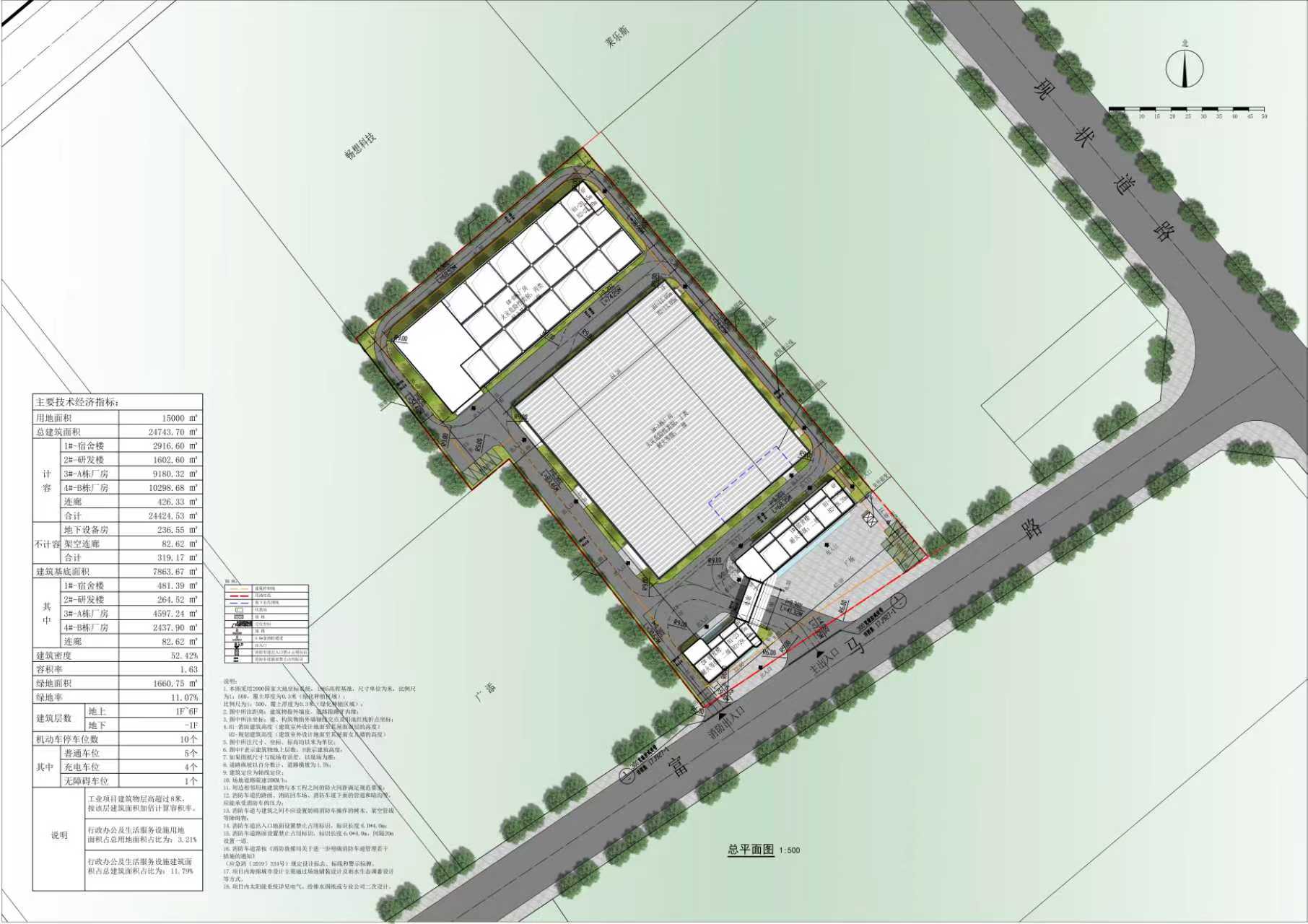 项目拟建设一栋六层宿舍楼,一栋六层研发楼,一栋单层丙类厂房及一栋四层丙类厂房,沿南门富马路设主要出入口。方案主要经济技术指标为:总建筑面积共24736.2平方米(其中计容建筑面积为24417.03平方米、不计容建筑面积为319.17平方米),容积率为1.63,建筑密度为52.37%,绿地率为11.88%。根据相关规定,我局将对该设计方案(具体方案详见附图)进行批前公示。