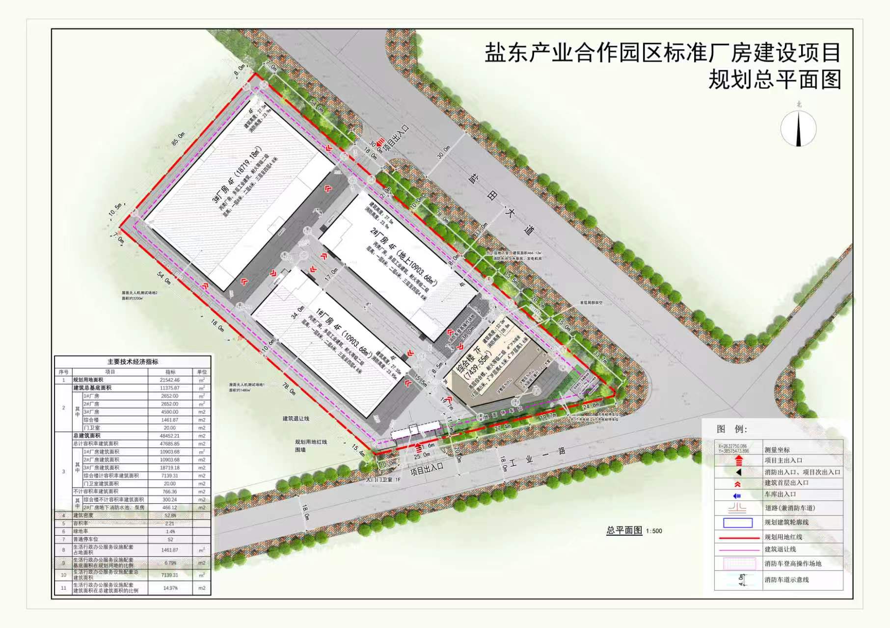 项目位于东源县盐(田)东(源)共建现代物流园工业大道以东、工业一路以北XT-02-13地块,用地面积共21543.46平方米,用地性质为工业用地,建设单位为东源县盐东产业投资发展有限公司。项目拟建设三栋四层丙类厂房,一栋七层综合楼(一层为厨房、饭堂、架空层,二、三层为办公区,四至七层为宿舍),沿工业一路及盐田大道设置主要出入口。方案主要经济技术指标为:总建筑面积共48452.21平方米(其中计容建筑面积为47986.09平方米、不计容建筑面积为466.12平方米),容积率为2.23,建筑密度为52.8%,绿地率为1.4%。